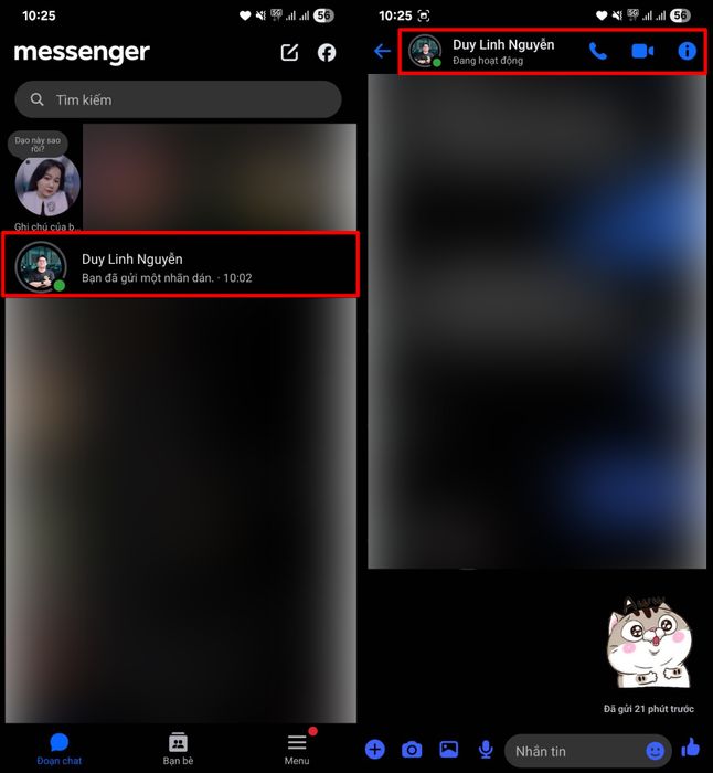 Bước 1: Mở ứng dụng Messenger trên điện thoại của bạn > Chọn một cuộc trò chuyện bất kỳ mà bạn muốn thay đổi cài đặt > Sau đó, nhấn vào biểu tượng avatar hoặc dấu chữ i ở góc trên bên phải để truy cập cài đặt của cuộc trò chuyện đó.