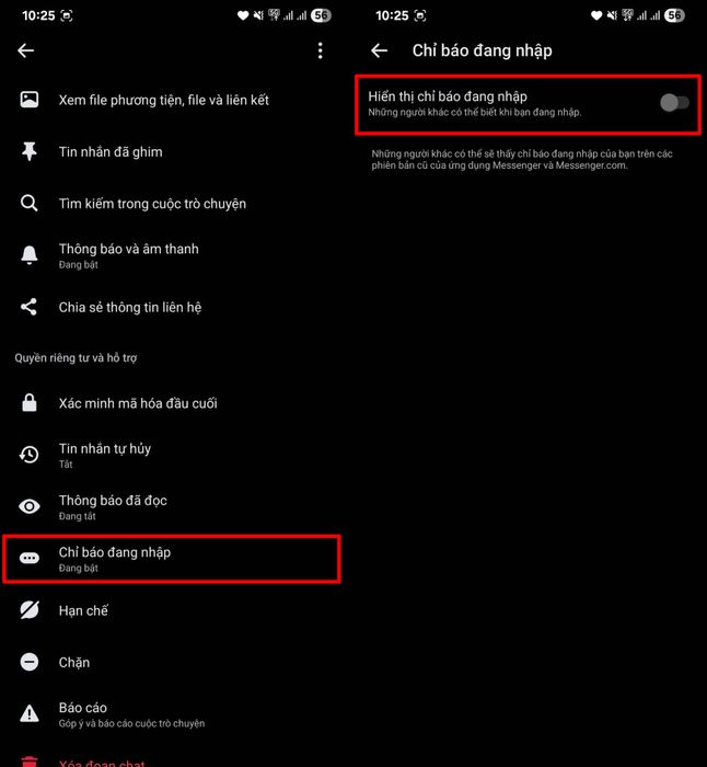Bước 2: Kéo xuống cuối trang cài đặt và tìm mục Chỉ báo đang nhập. Nhấn vào mục này và tắt tính năng hiển thị chỉ báo khi bạn đang soạn tin nhắn. Sau khi tắt, người khác sẽ không biết bạn đang soạn tin.