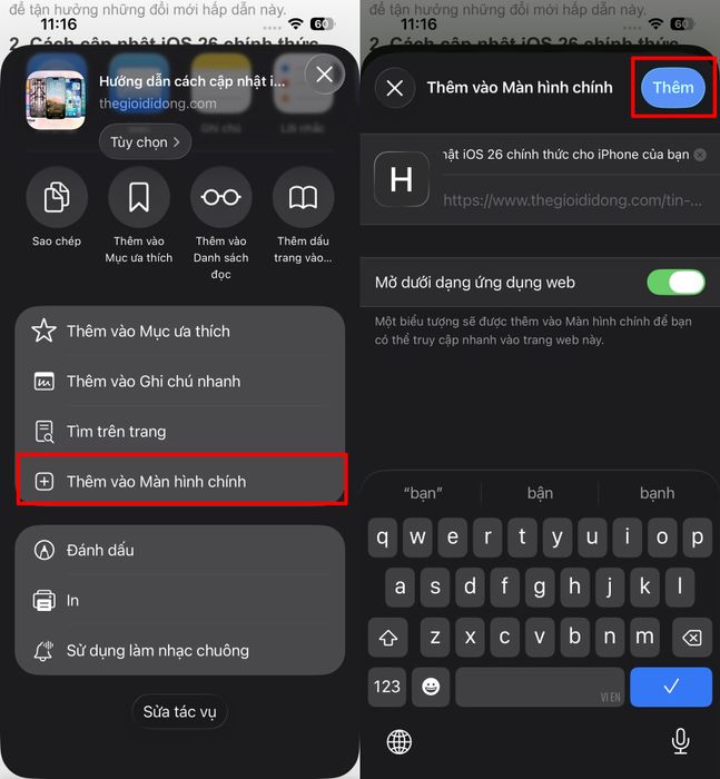 Tính năng thêm trang web vào màn hình chính trên iOS 26 mang lại trải nghiệm giống như sử dụng một ứng dụng web, giúp bạn truy cập nhanh chóng và thuận tiện hơn. Chỉ với vài bước đơn giản, bạn có thể mở các trang yêu thích trực tiếp từ màn hình chính mà không cần qua Safari. Cảm ơn bạn đã theo dõi bài viết, nếu thấy hữu ích hãy like và share để ủng hộ mình nhé!