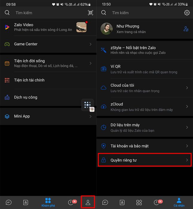 Bước 1: Mở ứng dụng Zalo trên điện thoại của bạn > Chọn biểu tượng Trang cá nhân > Tiếp theo, vào mục Quyền riêng tư để điều chỉnh quyền truy cập.