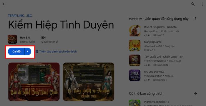 Bước 4: Từ màn hình chính LDPlayer, truy cập CH Play > Tìm kiếm với từ khóa Kiếm Hiệp Tình Duyên > Chọn game và nhấn Cài đặt. Chờ quá trình tải về và cài đặt hoàn tất.