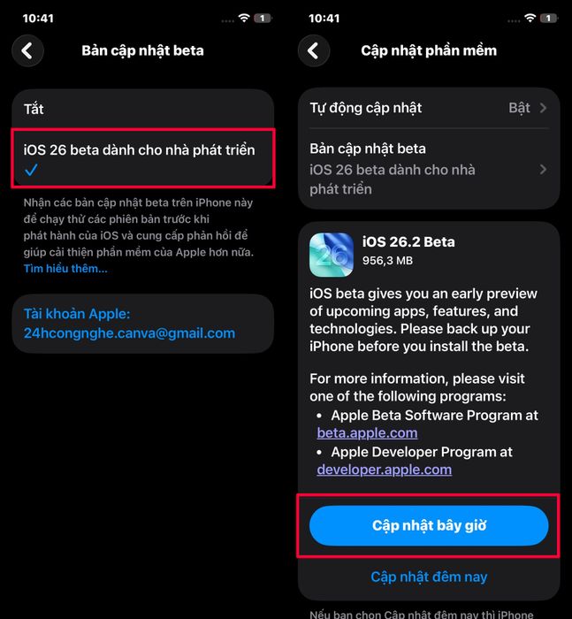 Bước 3: Chọn mục Bản cập nhật beta > Nhấn vào iOS 26 dành cho nhà phát triển > Quay lại màn hình Cập nhật phần mềm, bạn sẽ thấy iOS 26.2 có sẵn, nhấn Cập nhật để hoàn tất quá trình cài đặt.