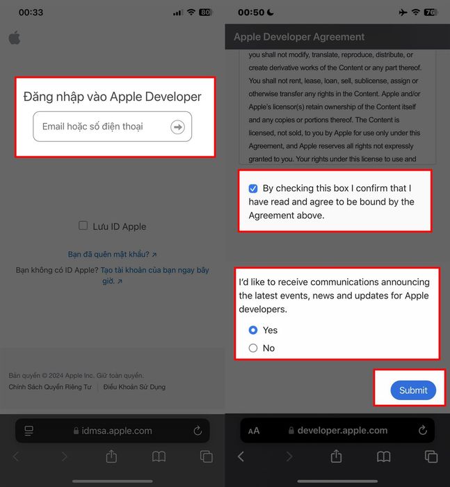Bước 1: Để cài đặt iOS 26.2 Beta trên điện thoại, bạn cần tham gia chương trình Developer Beta của Apple bằng ID Apple của mình. Nếu bạn chưa tham gia, hãy truy cập vào đường link dưới đây > Đăng nhập vào tài khoản Apple của bạn > Tích chọn như trong hình và nhấn Submit để đăng ký tham gia.