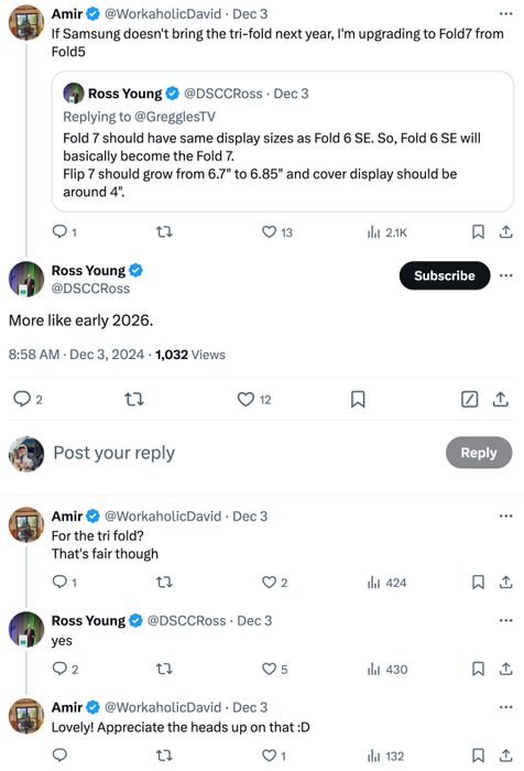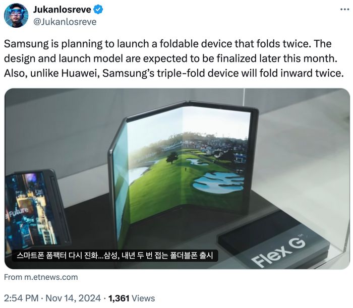 Chuyên gia phân tích Ross Young chia sẻ rằng chiếc smartphone Samsung gập ba sẽ được ra mắt vào đầu năm 2026. Nguồn: Tài khoản X (Twitter) của Ross Young.