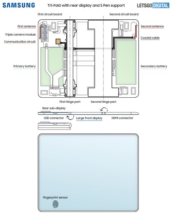 Vào tháng 12/2021, Samsung đã nộp đơn xin cấp bằng sáng chế cho một thiết bị di động với màn hình gập theo dạng ba phần tại WIPO. Nguồn tham khảo: LetsGoDigital.