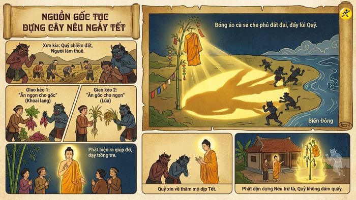 Phật đã treo chiếc áo cà sa lên ngọn tre, hóa phép để bóng áo phủ kín đất đai, đẩy lũ Quỷ ra ngoài biển Đông. Trước khi rời đi, Quỷ xin Phật cho phép chúng được về đất liền thăm mộ tổ tiên vào mỗi dịp Tết. Phật đã đồng ý nhưng dặn dò con người phải dựng cây nêu trước cửa để ngăn Quỷ quấy phá. Từ đó, tục lệ dựng cây nêu ra đời và duy trì đến ngày nay.
