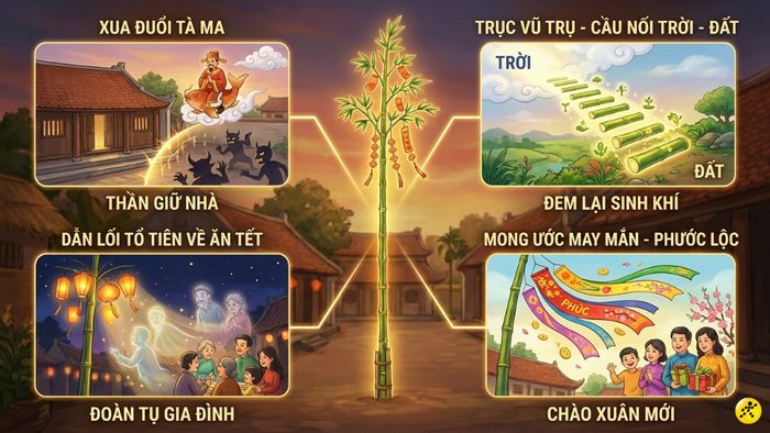 Biểu tượng của trục vũ trụ: Cây nêu được xem là cầu nối giữa Trời và Đất, với các đốt tre tượng trưng cho bậc thang dẫn lối cho sinh khí và phước lành từ trên trời xuống đất.