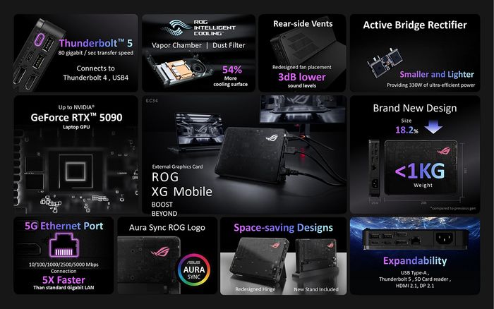ASUS vừa tiết lộ XG Mobile 2025, eGPU Thunderbolt 5 đầu tiên với khả năng cung cấp hiệu năng đồ họa mạnh mẽ từ GPU GeForce RTX 5090 mới ra mắt, cùng nhiều cổng kết nối tiện lợi chỉ qua một sợi cáp duy nhất.
