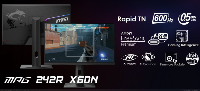 MPG 242R X60N mang đến tần số quét lên đến 600 Hz, đảm bảo độ mượt mà và phản hồi nhanh chóng cho các tựa game thi đấu. Màn hình sử dụng tấm nền Rapid TN, với độ phân giải Full HD (1080p), giúp các card đồ họa hiện đại đạt tốc độ khung hình cao nhất.