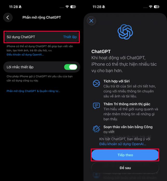 Bước 2: Tiếp theo, chọn mục Sử Dụng để cấu hình > Sau đó, nhấn vào Tiếp tục để kích hoạt tính năng trong Apple Intelligence.