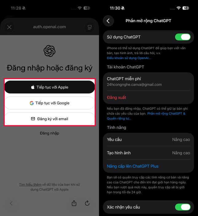 Bước 3: Nhấn vào mục Bật để tích hợp vào Apple Intelligence trên iPhone > Sau đó, hãy Bật tính năng Sử dụng và Đăng nhập tài khoản của bạn.