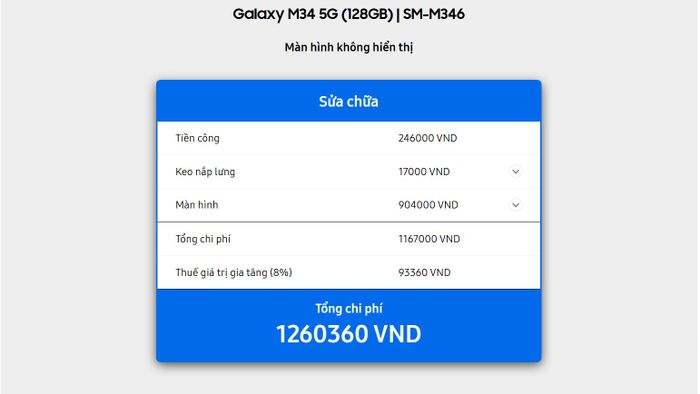 Đây là kênh thông tin chính thức từ Samsung Việt Nam, cho phép người dùng tra cứu nhanh các khoản phí sửa chữa ngoài bảo hành, trong đó có dịch vụ thay màn hình chính hãng.