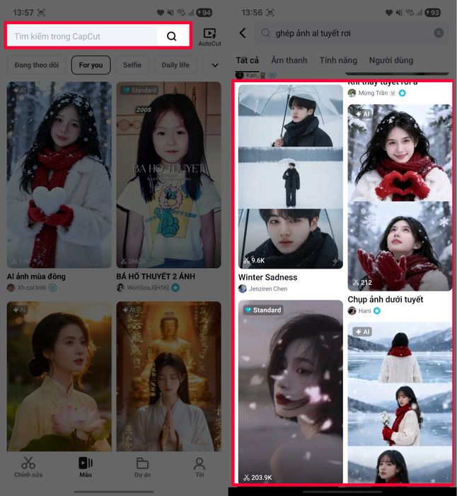 Bước 1: Mở ứng dụng CapCut trên điện thoại của bạn > Nhấn vào ô Tìm kiếm > Gõ từ khóa "ảnh tuyết rơi mùa đông". Ngay lập tức, các mẫu CapCut tạo hiệu ứng tuyết rơi sẽ xuất hiện trên màn hình của bạn.