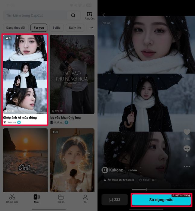 Bước 2: Chọn mẫu CapCut mà bạn muốn dùng để tạo hiệu ứng tuyết rơi theo xu hướng mùa đông.