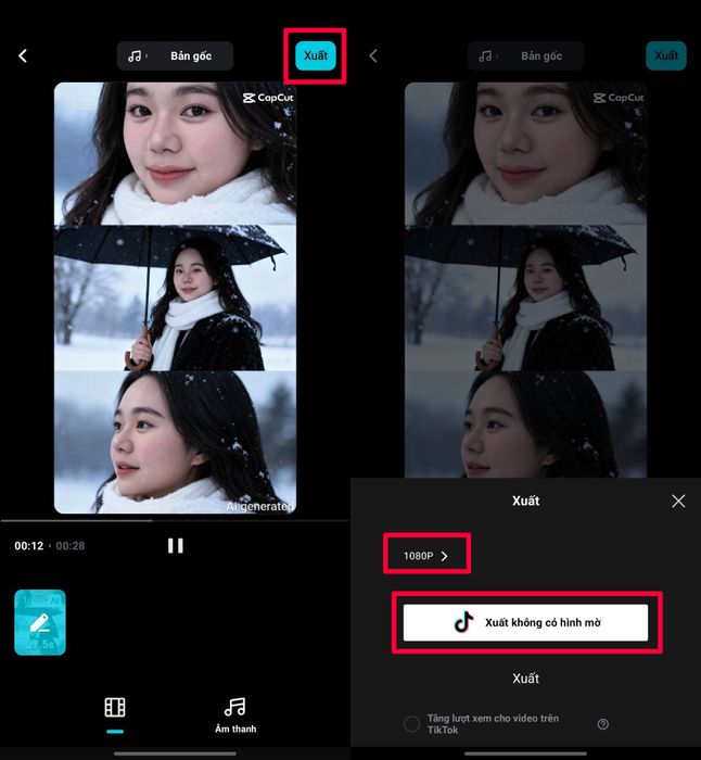 Bước 4: Chờ khoảng 1 phút để AI hoàn tất quá trình tạo video > Khi kết quả xuất hiện, nhấn Xuất > Chọn độ phân giải video muốn xuất ra. Nếu không muốn video có watermark TikTok, đừng quên bật tùy chọn Bỏ Watermark trước khi lưu.