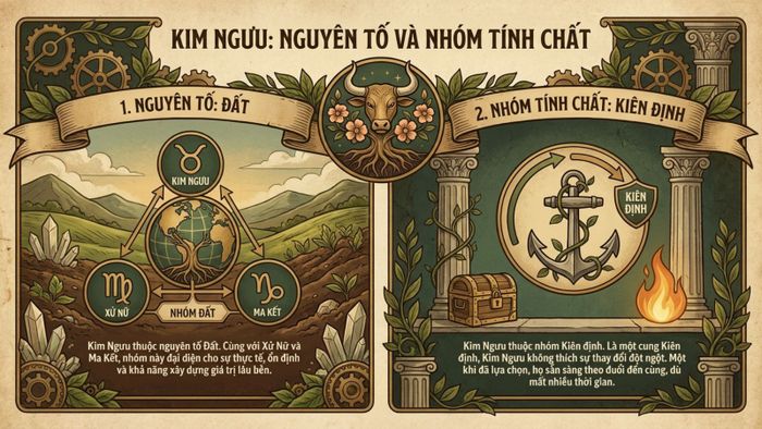 Kim Ngưu thuộc nhóm nguyên tố Đất, cùng với Xử Nữ và Ma Kết. Nhóm này đại diện cho sự thực tế, ổn định và khả năng kiến tạo những giá trị bền vững theo thời gian.