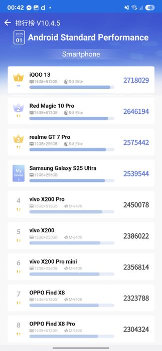 Điểm hiệu năng AnTuTu của Galaxy S25 Ultra, xếp hạng thứ 4 toàn cầu, chỉ sau ba mẫu smartphone gaming - Ảnh chụp màn hình