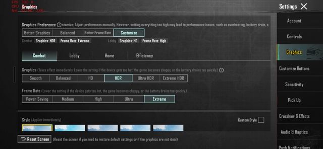 Nếu bạn vẫn muốn giữ đồ họa đẹp mắt nhưng không giảm mượt mà, chúng tôi khuyến khích thiết lập đồ họa ở mức HDR và FPS ở mức Extreme, lúc này FPS tối đa của PUBG Mobile là 60.