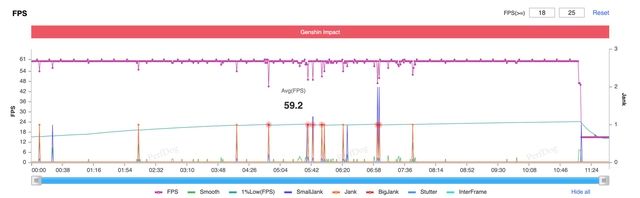 Genshin Impact đã nổi tiếng là tựa game cực kỳ thử thách các dòng chip mạnh nhất trên mobile. Tuy nhiên, với thiết lập đồ họa Cực cao và FPS tối đa 60, Galaxy S25 Ultra vẫn duy trì được FPS trung bình 59,2, chỉ có chút dao động nhẹ trong những cảnh tải nặng nhưng không làm giảm đi trải nghiệm chơi game.