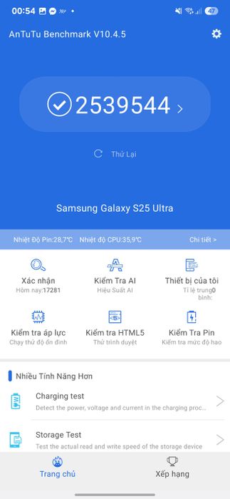 - AnTuTu Benchmark: 2,54 triệu điểm, một mức điểm cao thuộc top đầu trong số các mẫu smartphone flagship Android.