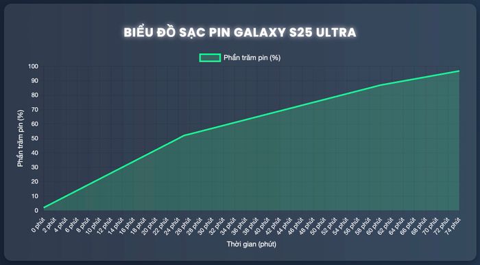 Sử dụng củ sạc Ugreen công suất 65W, Galaxy S25 Ultra có thể sạc đầy 100% pin trong 74 phút. Trong suốt quá trình sạc, máy chỉ ấm nhẹ ở mặt lưng.