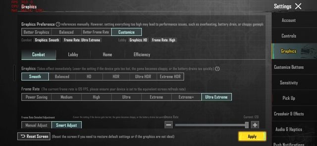 Với tựa game bắn súng TPS/FPS yêu cầu phản xạ nhanh, chúng tôi đã thiết lập đồ họa ở mức Smooth, FPS Ultra Extreme để đạt mức FPS 120 cho PUBG Mobile.