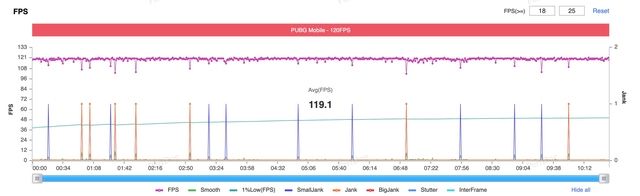 Biểu đồ FPS cho thấy Galaxy S25 Ultra duy trì mức FPS trung bình là 119,1 khi chơi ở chế độ này.
