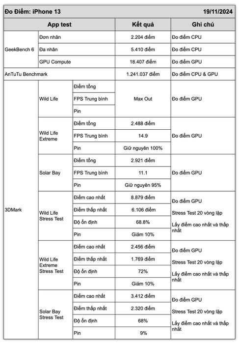 Dưới đây là các tiêu chí mà mình sử dụng để đánh giá hiệu năng của iPhone 13, chi tiết như sau:- Áp dụng ba phần mềm chuyên dụng để đánh giá hiệu năng: GeekBench 6, AnTuTu Benchmark và 3DMark.