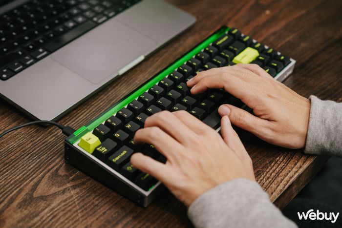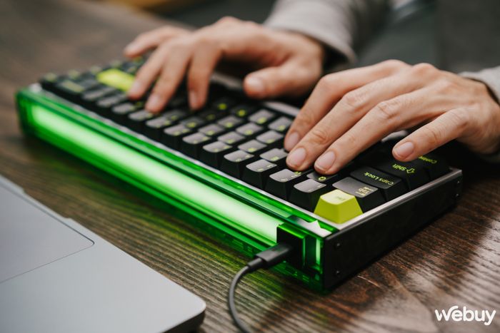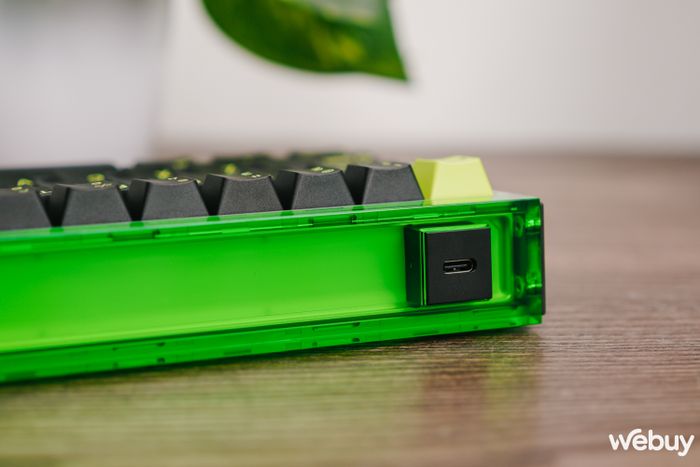 Điểm đáng chú ý nhất trên vỏ ngoài của bàn phím chính là phần cạnh trên, với một miếng nhựa khá dày có màu xanh neon nổi bật.