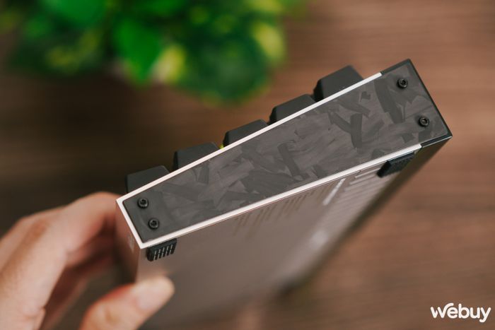 Không phải mặt nào của phím cũng được làm bằng nhôm, bởi khi nhìn từ hai cạnh bên, bạn sẽ thấy hai tấm làm từ sợi carbon. Sợi carbon không được xử lý để có bề mặt đồng nhất mà thay vào đó là họa tiết đan chéo nhau, tạo điểm nhấn đặc biệt.