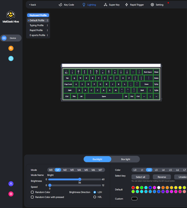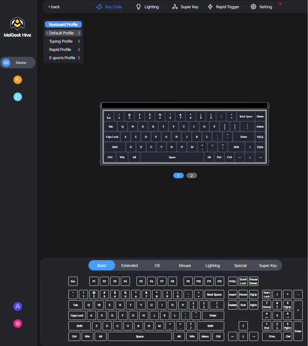 Giống như một số hãng bàn phím mới khác, MelGeek cũng chuyển sang sử dụng phần mềm điều khiển bàn phím trực tuyến, giúp người dùng không cần phải tải thêm phần mềm nào về máy tính. Phần mềm này hỗ trợ điều chỉnh đèn nền, tắt mở đèn ở vỏ bàn phím, và quan trọng nhất là cho phép điều chỉnh vị trí kích hoạt của switch Hall Effect.