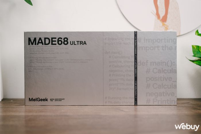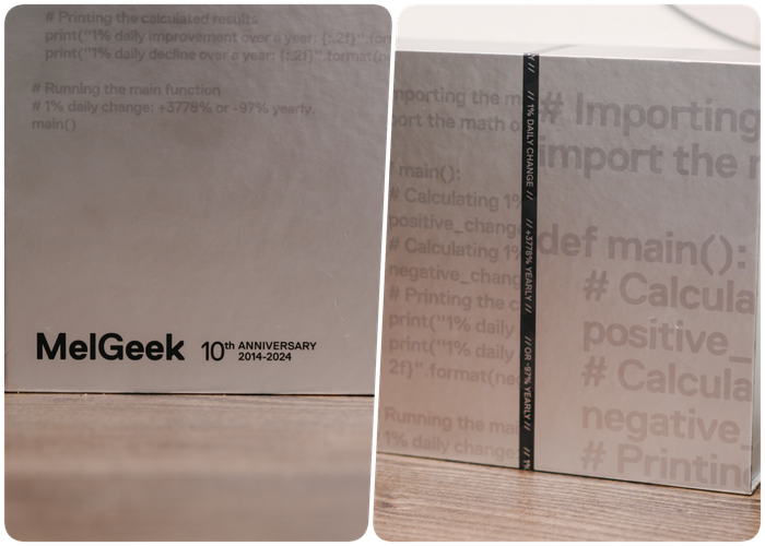 Vỏ hộp của bàn phím được trang trí khá bắt mắt, với các dòng code đan xen, góc trái có dòng chữ giới thiệu về việc đây là chiếc bàn phím kỷ niệm 10 năm thành lập MelGeek (2014 - 2024).