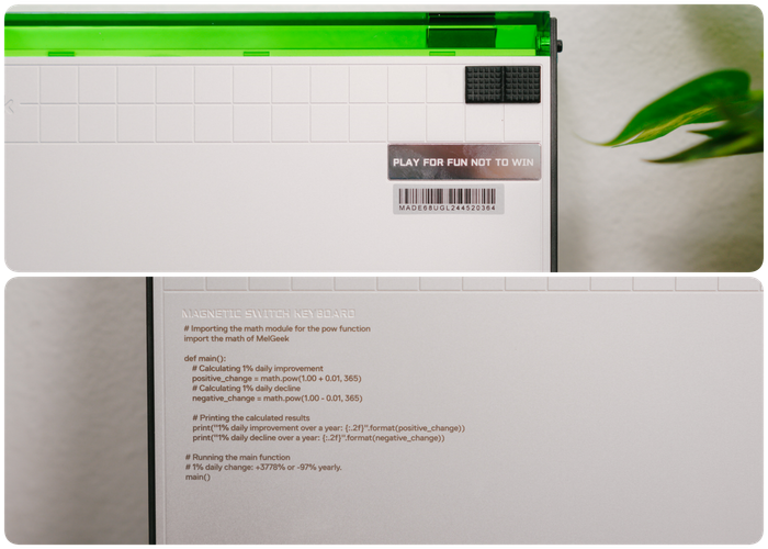 Sự tinh tế trong thiết kế của bàn phím vẫn không dừng lại! Lật mặt đáy, bạn sẽ thấy ở góc phải dòng khẩu hiệu của MelGeek: “Play for fun not to win” , tạm dịch là “Chơi cho vui chứ không ham chiến thắng” . Bên trái là những dòng code với câu nói “Tốt hơn mỗi ngày dù chỉ 1%”, rất ý nghĩa!