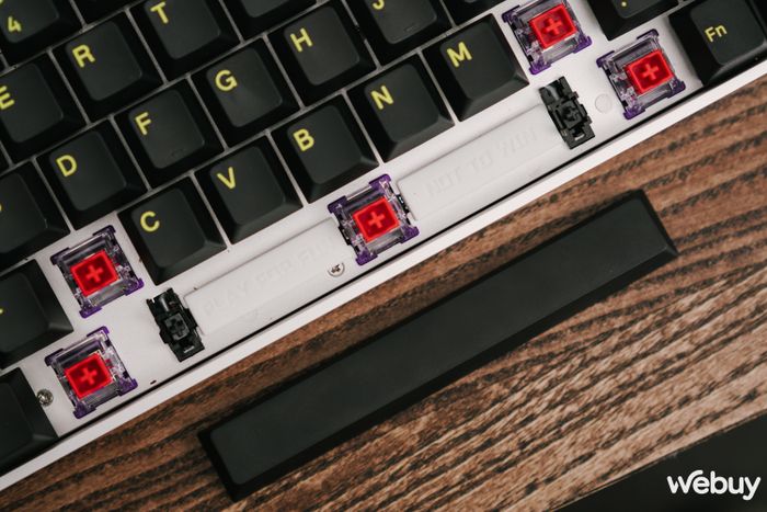 Với những phím dài, MelGeek sử dụng bộ stabilizer kiểu Cherry (đầu cắm hình chữ thập giống như switch), đã được bôi mỡ sẵn để hạn chế tình trạng lọc xọc. Bên dưới phím Space, phím dài nhất, hãng còn thêm vào hai miếng cao su nhỏ để giảm âm thanh, và có dòng chữ “Play for fun not to win” ở đó.