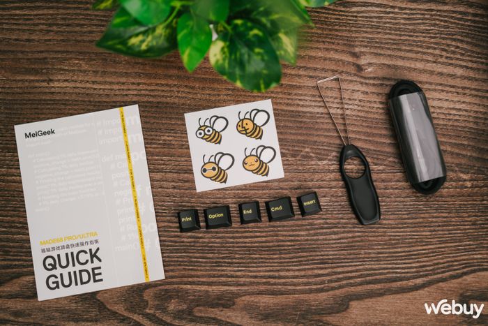 Mở hộp, bạn sẽ tìm thấy bộ phụ kiện bao gồm sách hướng dẫn sử dụng, một vài miếng dán hình con ong - logo đặc trưng của MelGeek, dây kết nối USB-C bọc dù và công cụ tháo keycap.