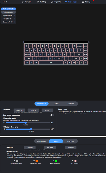 Như đã nói trước đó, việc điều chỉnh vị trí kích hoạt này nên được tùy chỉnh theo nhu cầu sử dụng, và phần mềm điều khiển cho phép lưu các profile để dễ dàng chuyển đổi. Trong phần mềm này, người dùng còn có thể thấy các profile dành cho các loại switch khác nhau, chứng tỏ rằng MADE68 Ultra có thể thay thế switch, nhưng phải là những loại switch từ tính.