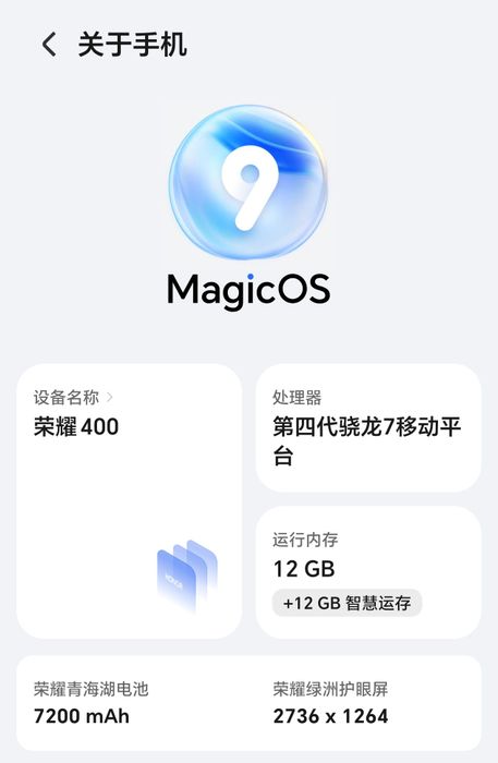 Hình ảnh trên cho thấy phiên bản HONOR 400 dành cho thị trường Trung Quốc sẽ sở hữu màn hình với độ phân giải 1.5K (2736 x 1264 pixels), vi xử lý Snapdragon 7 Gen 4, 12 GB RAM vật lý, 12 GB RAM ảo và viên pin cực kỳ lớn với dung lượng 7200 mAh. Ngược lại, phiên bản quốc tế dự kiến chỉ có viên pin 5300 mAh.