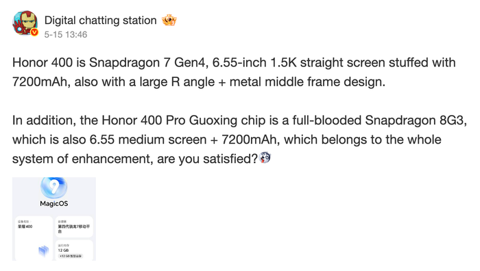 HONOR 400 Series sẽ ra mắt vào tháng 5 tại cả hai thị trường quốc tế và Trung Quốc.Vào ngày 22/5, HONOR sẽ ra mắt các mẫu HONOR 400 và HONOR 400 Pro dành cho thị trường toàn cầu. Cả hai phiên bản này sẽ được trang bị vi xử lý Snapdragon 7 Gen 3 (HONOR 400) và Snapdragon 8 Gen 3 (HONOR 400 Pro). Các mẫu này đều sở hữu viên pin dung lượng 5300 mAh. Nguồn tin từ một số nơi cho biết dòng HONOR 400 cũng sẽ được trình làng tại Trung Quốc vào ngày 28/5.