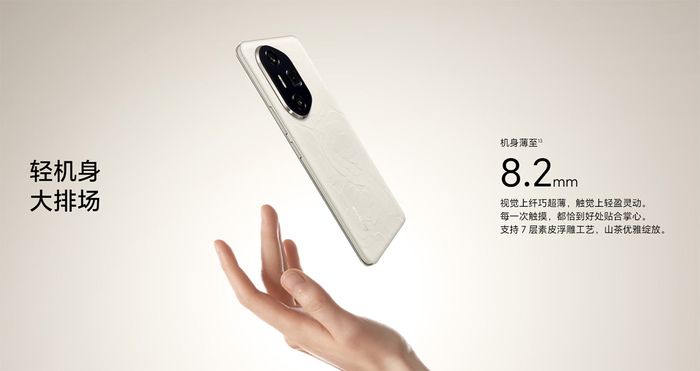 HONOR 300 Ultra được định vị ở phân khúc cao cấp hơn so với HONOR 300 tiêu chuẩn và HONOR 300 Pro nhờ vào thiết kế tỉ mỉ. Mặt lưng của máy được hoàn thiện từ da trơn 7 lớp, với hoa văn được dập nổi tinh xảo, mang đến vẻ ngoài sang trọng. Dù có thiết kế cao cấp, máy vẫn rất thoải mái khi cầm với độ dày chỉ 8.2 mm và trọng lượng 199 gram.