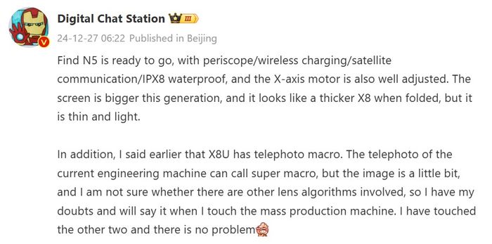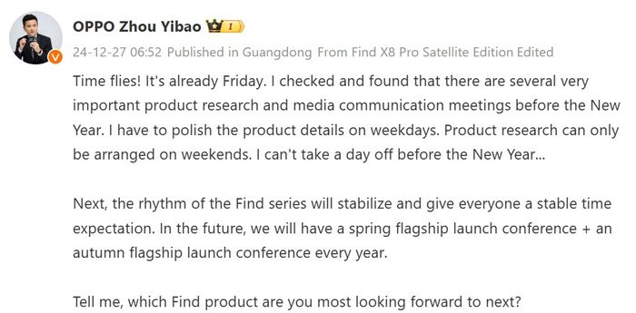 Trong phần bình luận chi tiết của bài đăng trên Weibo, ông Zhou Yibao cũng chia sẻ rằng mẫu flagship tiếp theo của OPPO sẽ là một chiếc smartphone gập và sản phẩm tiếp theo có thể là OPPO Find X8 Ultra.