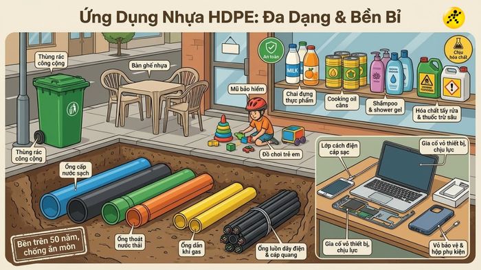 Với những tính chất "ngon" như độ bền, giá thành hợp lý và tính an toàn cao, nhựa HDPE đã có mặt ở khắp mọi nơi, từ các công trình hạ tầng lớn cho đến những vật dụng thường ngày trong nhà.