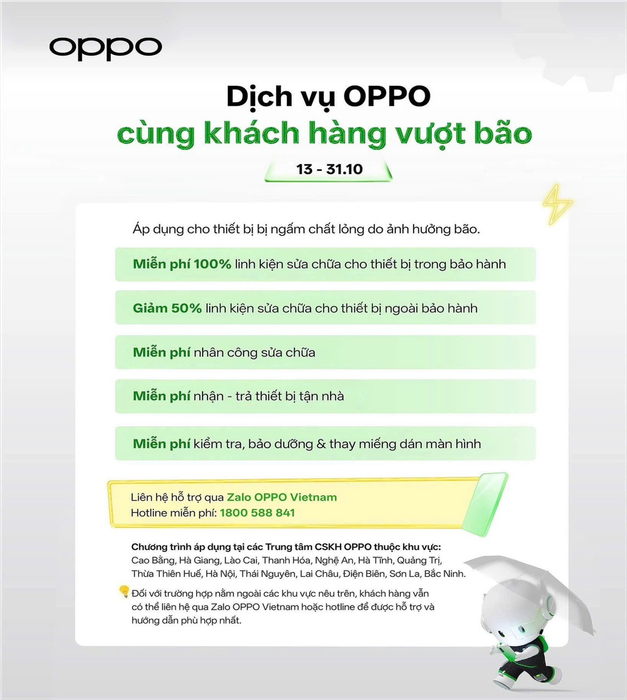 Dịch vụ OPPO đồng hành cùng khách hàng sau bão số 10 & 11 với chương trình hỗ trợ đặc biệt, áp dụng cho các thiết bị bị ngập nước hoặc hư hỏng do ảnh hưởng của bão.