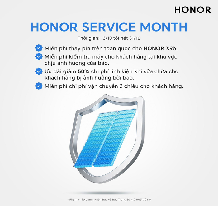- Miễn phí thay pin cho toàn bộ HONOR X9b trên phạm vi toàn quốc.