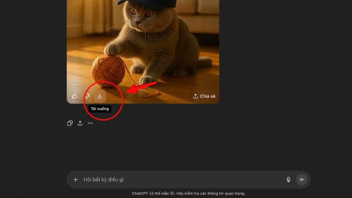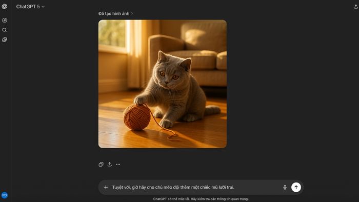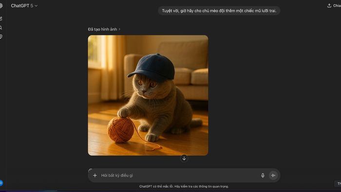 Bước 3: Đánh giá kết quả. Nếu kết quả chưa đạt yêu cầu, bạn có thể tiếp tục đưa ra lệnh chỉnh sửa. Ví dụ: "Tuyệt vời, giờ hãy cho chú mèo đội thêm một chiếc mũ lưỡi trai."