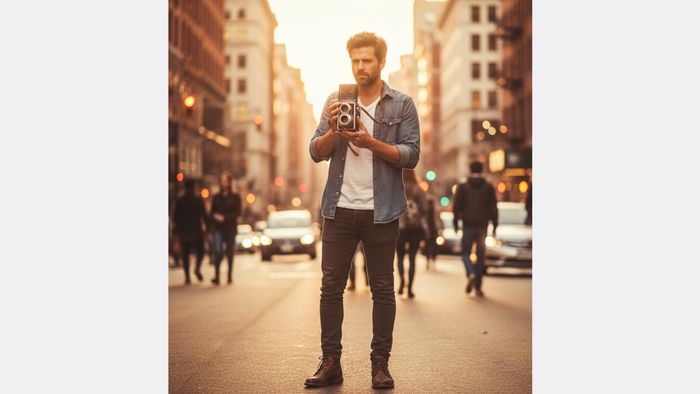 - Một nhiếp ảnh gia nam chuyên nghiệp, khoảng 30 tuổi, mặc trang phục giản dị nhưng thanh lịch, cầm máy ảnh cổ điển, nhìn chăm chú vào ống kính. Anh ấy đứng trên phố đông người vào giờ vàng, ánh sáng ấm áp chiếu sáng khuôn mặt. Phong cách: Nhiếp ảnh chân thực, độ sâu trường ảnh nông, ánh sáng điện ảnh.