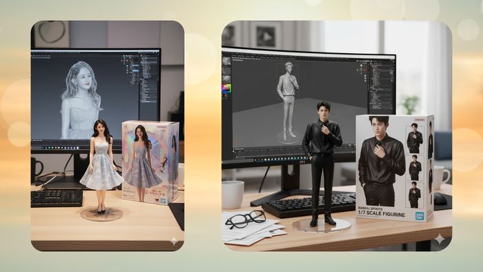 Prompt 1: Tạo mô hình nhân vật tỷ lệ 1/7 trong phong cách thực tế, đặt trong một môi trường thật. Mô hình được đặt trên bàn máy tính. Mô hình có đế acrylic trong suốt hình tròn, không có chữ trên đế. Màn hình máy tính hiển thị quá trình mô hình hóa 3D của mô hình này. Bên cạnh màn hình máy tính là hộp đồ chơi, thiết kế theo phong cách của các mô hình thu thập chất lượng cao, in hình nghệ thuật gốc. Hộp đồ chơi có các hình vẽ hai chiều trên bề mặt.