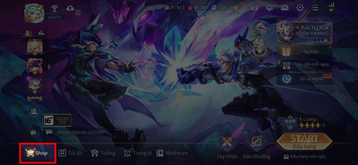 Bước đầu tiên: Khởi động game Liên Quân Mobile trên thiết bị của bạn > Từ màn hình chính, nhấn vào khu vực Cửa hàng để truy cập vào khu vực mua sắm các vật phẩm trong game. Đây là nơi hiển thị toàn bộ trang phục và item có sẵn.