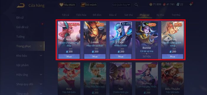 Bước tiếp theo: Trong khu vực Shop, di chuyển đến mục Skin và lựa chọn trang phục bạn mong muốn. Bạn có thể tìm kiếm theo tên tướng hoặc lọc theo loại skin để thuận tiện hơn khi chọn lựa.