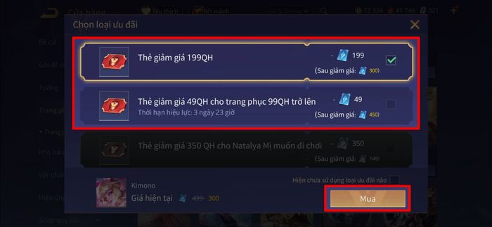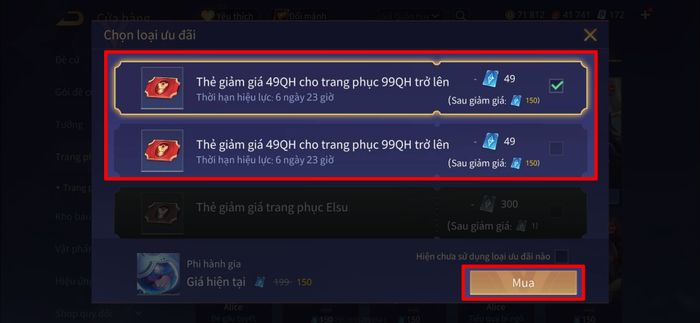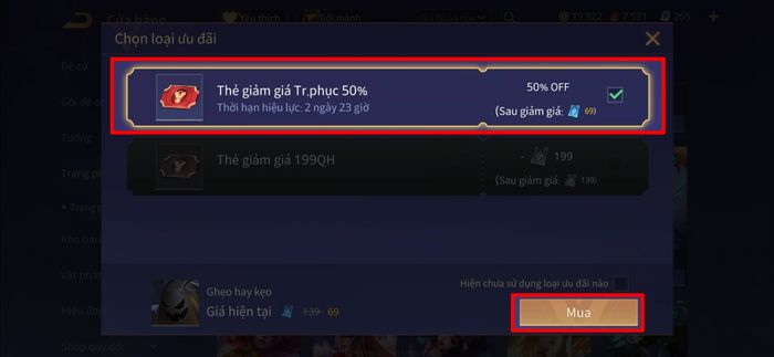 Bước 5: Hệ thống sẽ tự động hiển thị danh sách các voucher giảm giá khả dụng trong tài khoản của bạn. Hãy chọn thẻ ưu đãi có giá trị cao nhất phù hợp với hạng skin (S, SS, SSS) mà bạn đang mua. Sau khi chọn xong, nhấn Đồng ý mua để hoàn tất giao dịch.