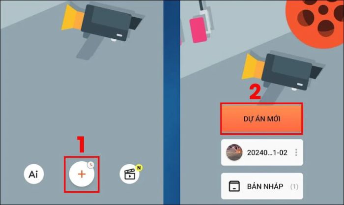 Bước 1: Mở ứng dụng Youcut trên điện thoại, sau đó nhấn vào dấu + ở giữa màn hình và chọn Dự án mới để bắt đầu.